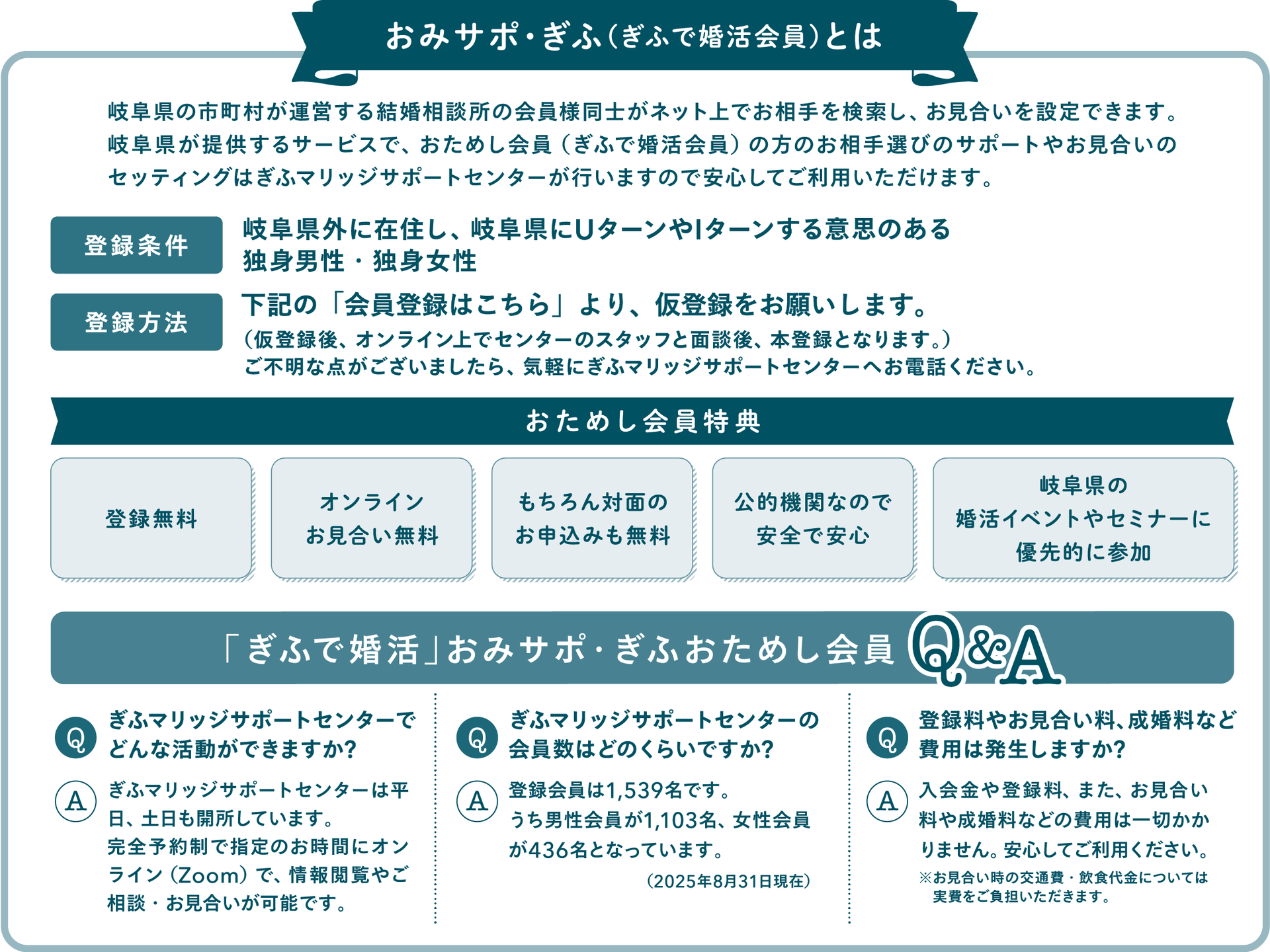 「ぎふで婚活」おみサポ・ぎふとは、岐阜県の各市町村が運営する結婚相談所をネットワーク化し、広域でのマッチングをサポートするシステムです。「婚活では、どのようなことに気を付けたらよいか?」「お見合いの時の注意点」「交際中のデートはどうすれば⋯」など、婚活についてのお悩みに岐阜県結婚支援コンシェルジュがお答えします。